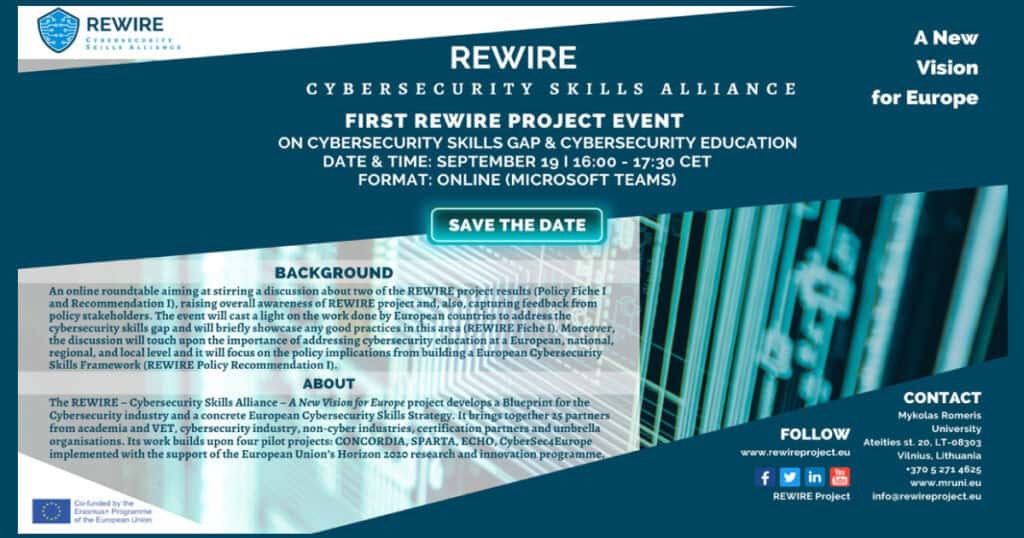 First REWIRE project event on Cybersecurity Skills Gap & Cybersecurity Education DATE & TIME: SEPTEMBER 19 I 16:00 – 17:30 CET FORMAT: ONLINE (MICROSOFT TEAMS) AGENDA 16.00 – 16.10: Introduction of REWIRE by Andrius Bambalas, Project Coordinator from Mykolas Romeris University (MRU) 16.10 – 16.30: Presentation of REWIRE Policy Fiche I and Recommendation I by […]
