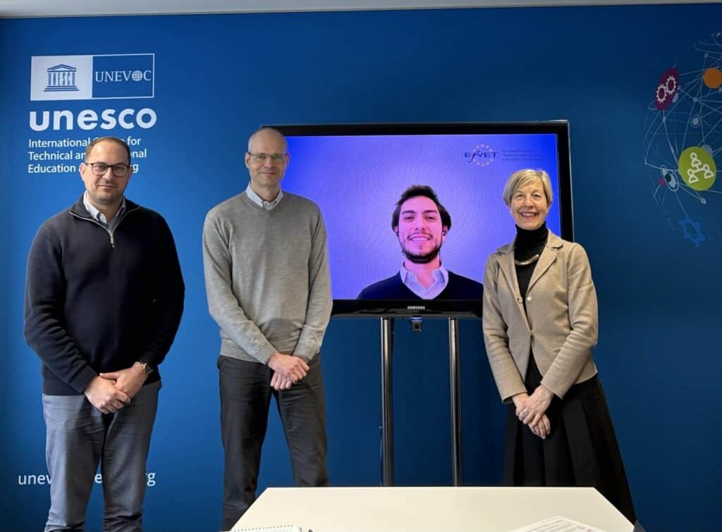 In January, Sylvia Liuti – VP Projects & Partnerships and Enrique Blanco – Development & Project Manager joined Friederich Huebler – Head of UNESCO-UNEVOC and Kenny Muscat – Programme Officer Innovation and Excellence in TVET in a hybrid meeting to review our partnership actions in 2025 and define a workplan for 2026.