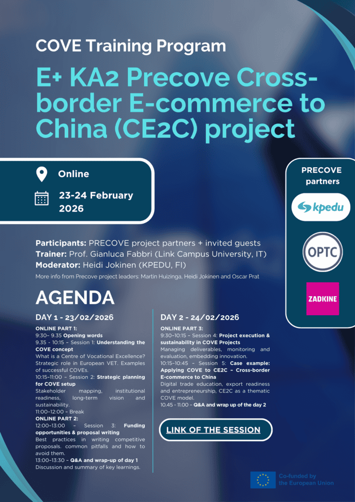 The COVE Training Programme, developed under the Erasmus+ KA2 PRECOVE – Cross-border E-commerce to China (CE2C) project, will take place online on 23–24 February 2026.