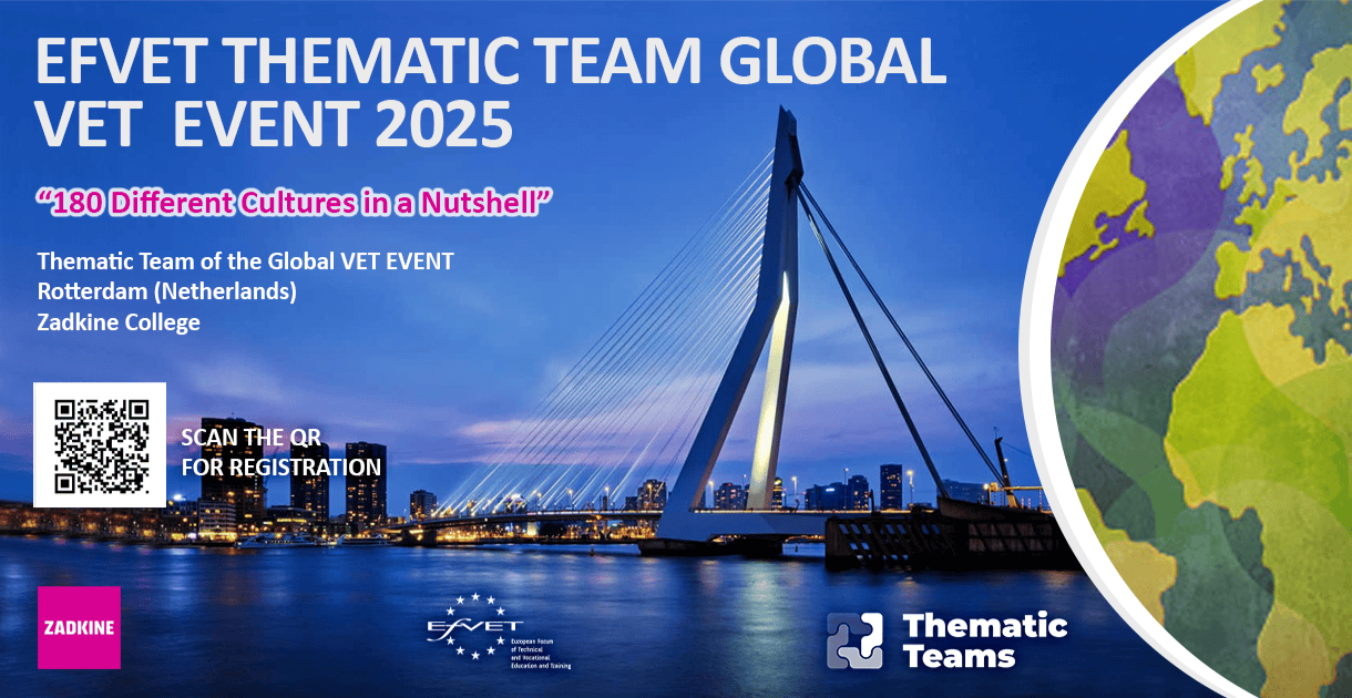 The EfVET Thematic Team Global VET is currently organising the annual Event of 2025, which will be hosted at Zadkine College, from 11 to 13 of March, in the heart of Rotterdam, Netherlands. It will be focused in discussing Global VET, a testament to our Global Outreach and Growth.