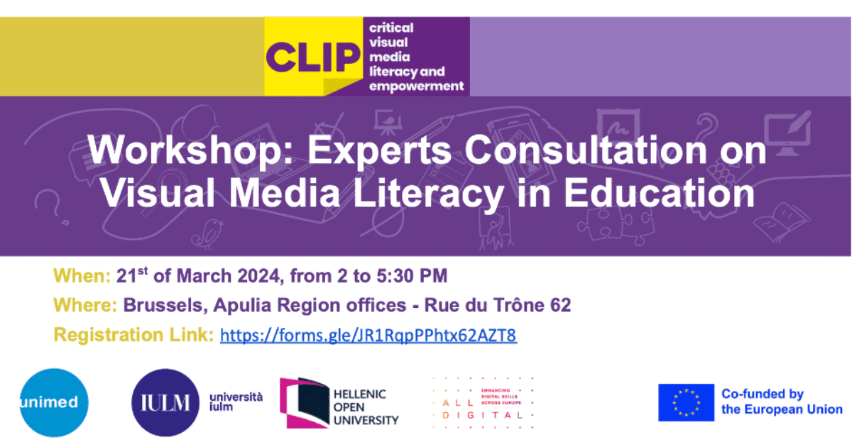 In the framework of the CLIP project final event, an upcoming “Expert Consultations on Visual Media Literacy in Education” workshop is scheduled for March 21, 2024 from 2:00 to 5:30 pm CET.