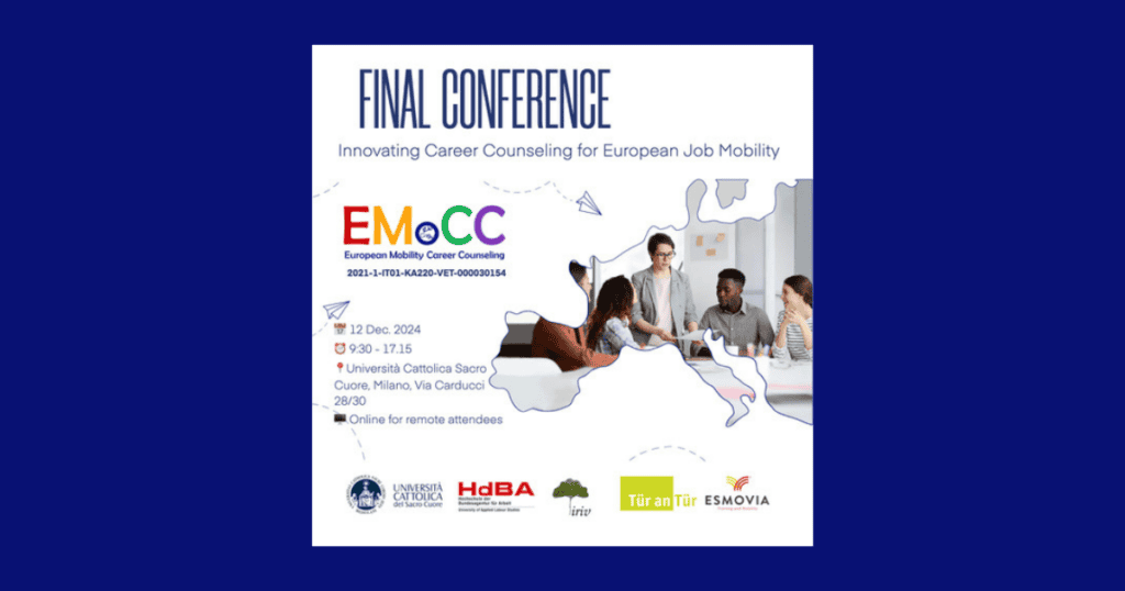 ✨ ESMOVIA is pleased to invite you to the Final Conference of the European project EMoCC (European Mobility Career Counselling), which will take place in Milan on December 12th, 2024. The title of the final conference is Innovating Career Counseling for European Job Mobility. The conference will include plenary sessions and three parallel working groups, providing […]